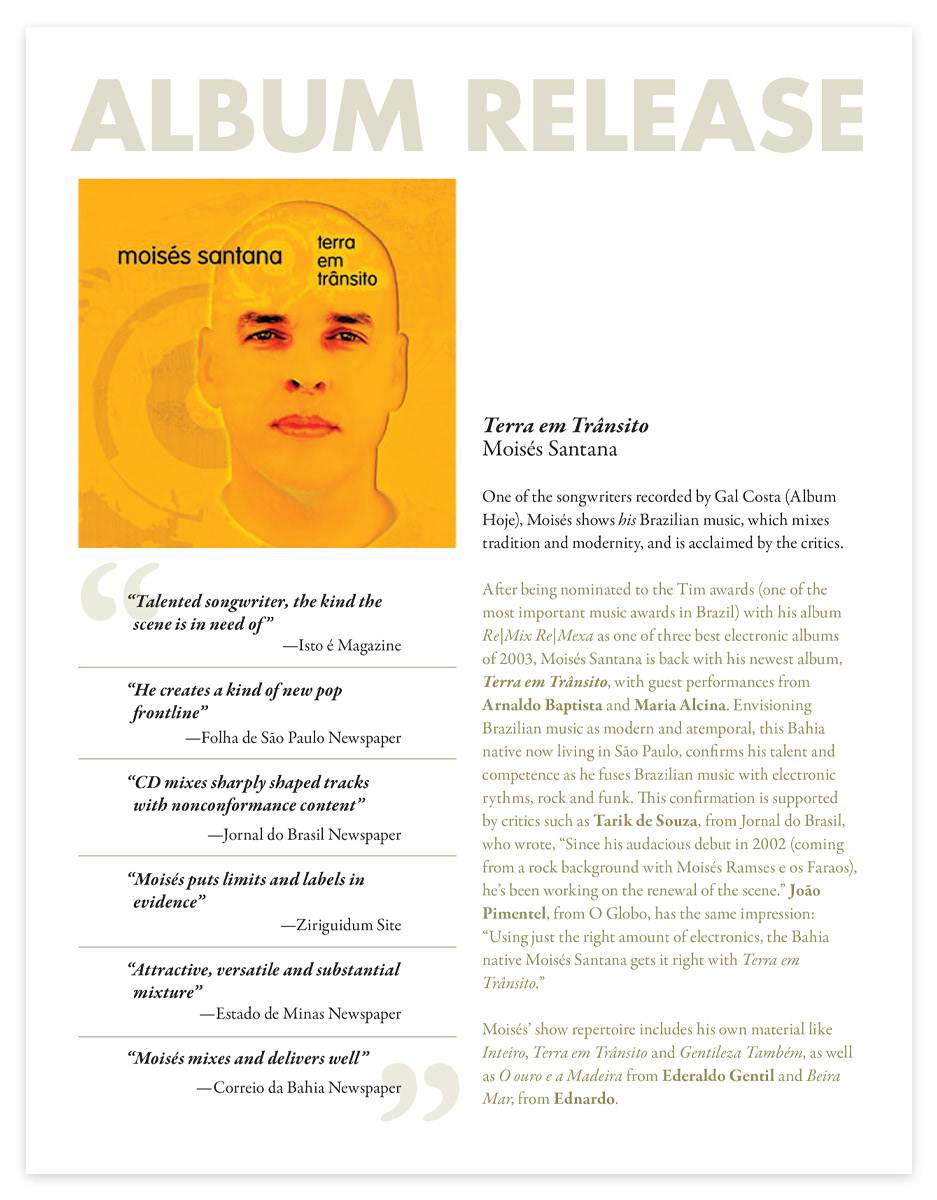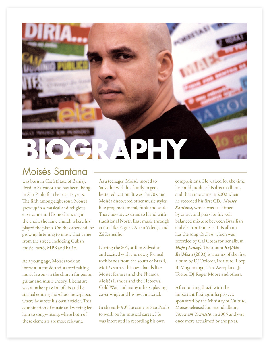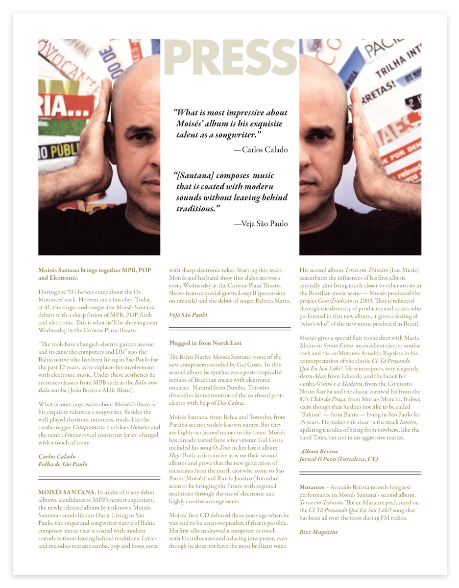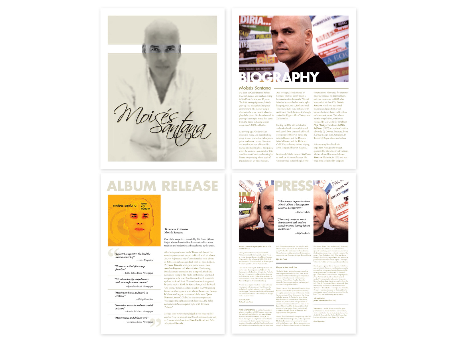 I designed a press release kit to promote Moisés Santana's second album. The kit includes a biography, album release information, the artists' press coverage and a publicity photo.